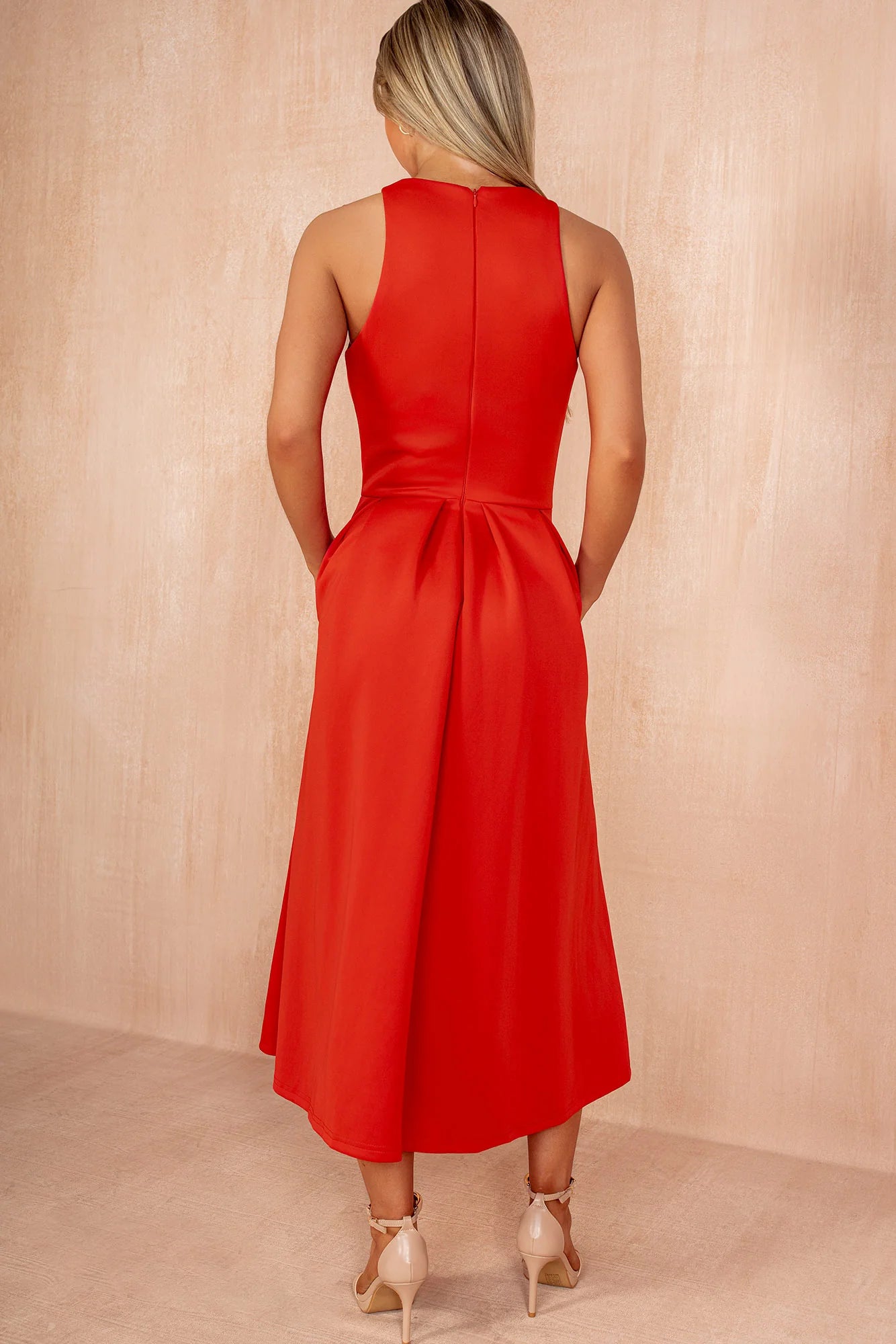Exude classic elegance in our Blood Orange Racer Neck Pleated Skirt Midi Dress. Featuring a racer neckline, a structured A-line midi skirt with box pleat details, side pockets and a back zip closure. Wear this classic piece with some court heels and a matching clutch for the perfect wedding guest or event look.